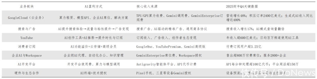 财报数据炫耀,2025财年谷歌总营收同比增长15%至4028.36亿好意思元,净利润同比增长32%至1321.7亿好意思元,净利润率高达32.8%。这一亮眼收货的中枢,在于谷歌构建了“自研芯片→云基础设施→大模子→全场景应用→多元变现”的垂直一体化AI盈利链:在C端,AI优化搜索体验,带动搜索告白收入同比增长17%;依托Gemini功能溢价,Google One、YouTube等订阅就业付用度户突破3.25亿,YouTube全年告白+订阅收入超600亿好意思元;Gemini月活达7.5亿,为高阶功能订阅奠定了坚实基础。