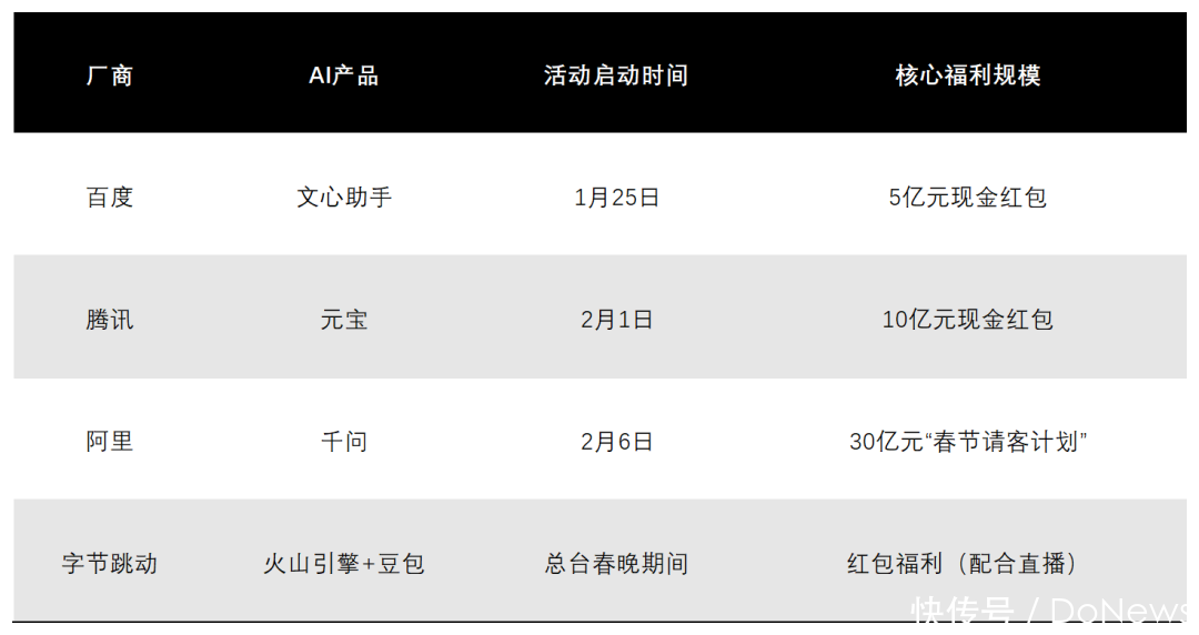 撰文 | 曹双涛 剪辑 | 杨博丞 题图 | 豆包AI 每年春节的红包大战,素来是互联网行业的晴雨表。2026年,这场战役的主角,悄然换成了AI。 当豆包、元宝、千问、文心一言携巨资涌入这场全民狂欢,名义上是搪塞裂变、场景免单的玩法之争,背后折射的却是大家C端AI营业化的集体急躁与解围尝试。 图源:基于公开信息整理DoNews制图 移动互联网期间,“高DAU”是通往盈利的门票;但在AI期间,重大的用户规模却可能升沉为千里重的算力“欠债”。传统“烧钱拉新→告白变现”的旅途遭受调节,大家头部AI产