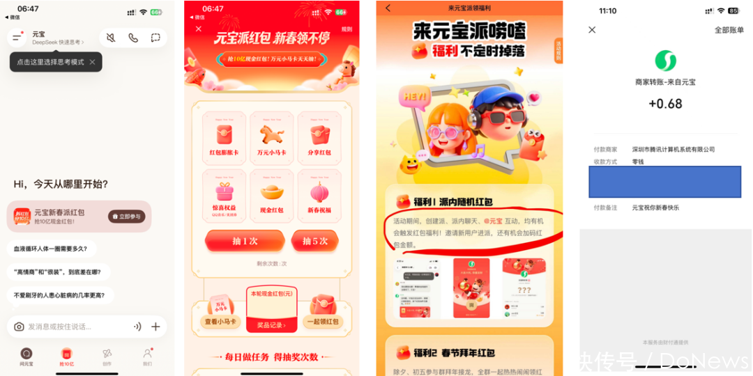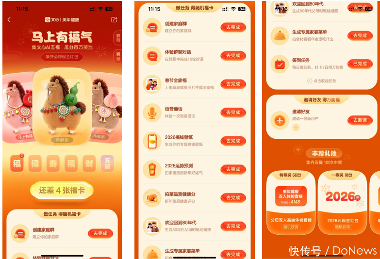 DoNews对元宝、千问、文心一言、豆包春节红包行为的多轮实测后发现,2026年的AI红包大战已告别同质化“撒钱”模式,呈现出权贵的生态资质各别化特征,各家均围绕自己中枢上风构建获客闭环。