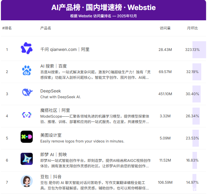 另一方面,行业竞争呈现倡导的梯队各别:字节靠速率制胜,阿里开源生态强盛但C端入场偏晚,腾讯则借助DeepSeek与微信生态快速追逐。AI产物榜数据炫耀,2025年12月千问以323.13%的环比增长率大幅率先豆包的14.97%,但其28.43M的打听量与豆包的106.59M仍存在倡导差距。