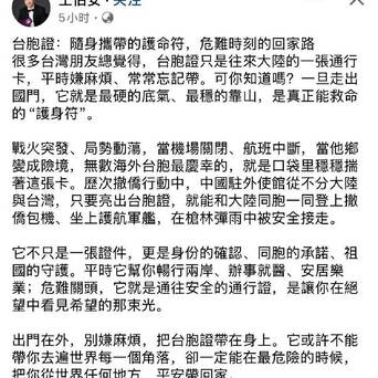 【台湾博主:台胞证随身带,吉祥与底气一谈皆在】有台湾博主终于意志到了台胞证的价值,民进党不救他们,还不让他们跟大陆飞机总结,让他们留在安全地带。