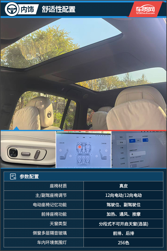 景况性建树方面,评测车座椅为真皮材质包裹,乘坐质感柔滑且撑握包裹到位,相助前排座椅加热、透风、推拿功能,即便远程乘坐也不会合计困窘。评测车选装分段式不成开启天窗,前后均带有电动遮阳帘,此外,前/后排侧窗多层隔音玻璃不错为车内营造一个至极静谧的空间。