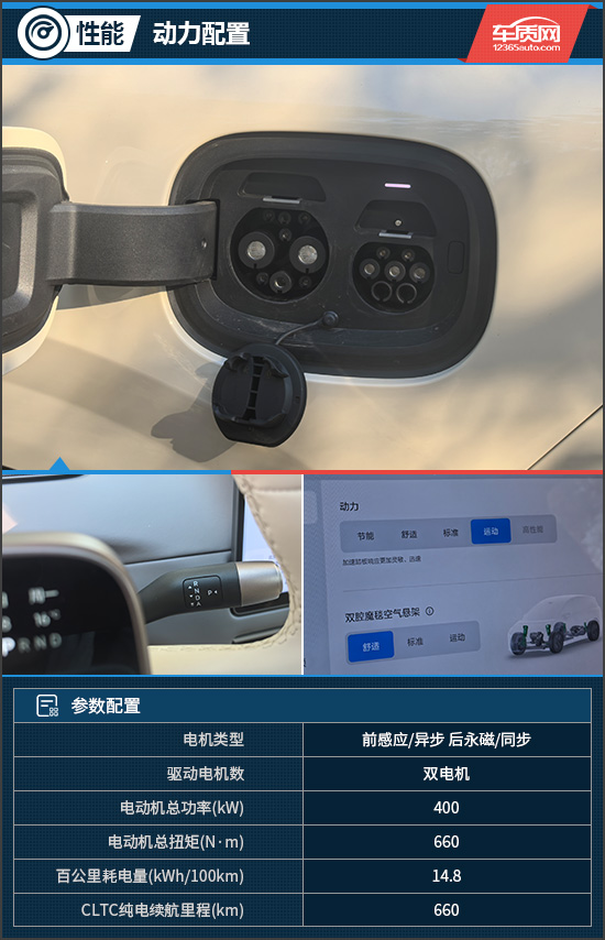能源系统方面,评测车搭载前后双电机,电动机总功率400kW、总扭矩660N·m,匹配能量为87.3kWh的电池包,CLTC纯电续航里程660km,成绩于5C超等快充时代,充电10分钟续航即可加多500km。