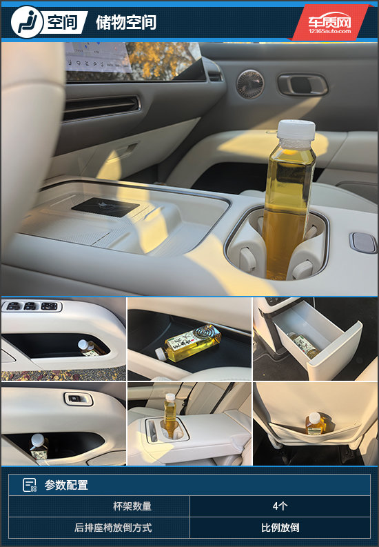 储物空间方面,评测车共有4个杯架且均有限位器,全车储物空间布局合理且容积可不雅,前后排乘客的随身物品均有合适位置摆放。评测车还选装了8.8L智能冷暖双用雪柜,便于存放饮料、食品等物品。