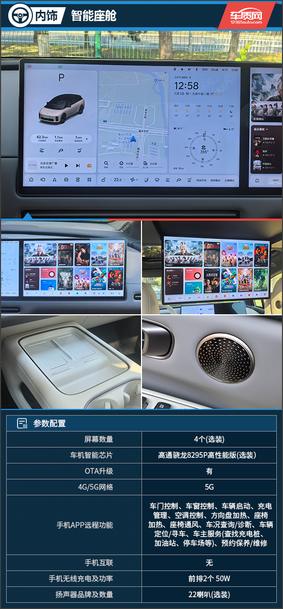 评测车配备15.7英寸中控屏,分袂率达到3K,副驾还提供了15.7英寸副驾文娱屏,系统操作浅易且反应赶快,可杀青四区域语音叫醒识别,通过叫醒词“理念念同学”开启互动,可范围导航、电话、空调、车窗等功能操作。由于评测车选装了后舱文娱屏套装,是以后排安装了21.4英寸文娱屏,车机芯片升级为高通骁龙8295P高性能版、扬声器数目也加多至22个。此外,前排中控台上方的无线充电池面积宽大,拿甩手机十分便捷,且充电功率皆达到了50W。